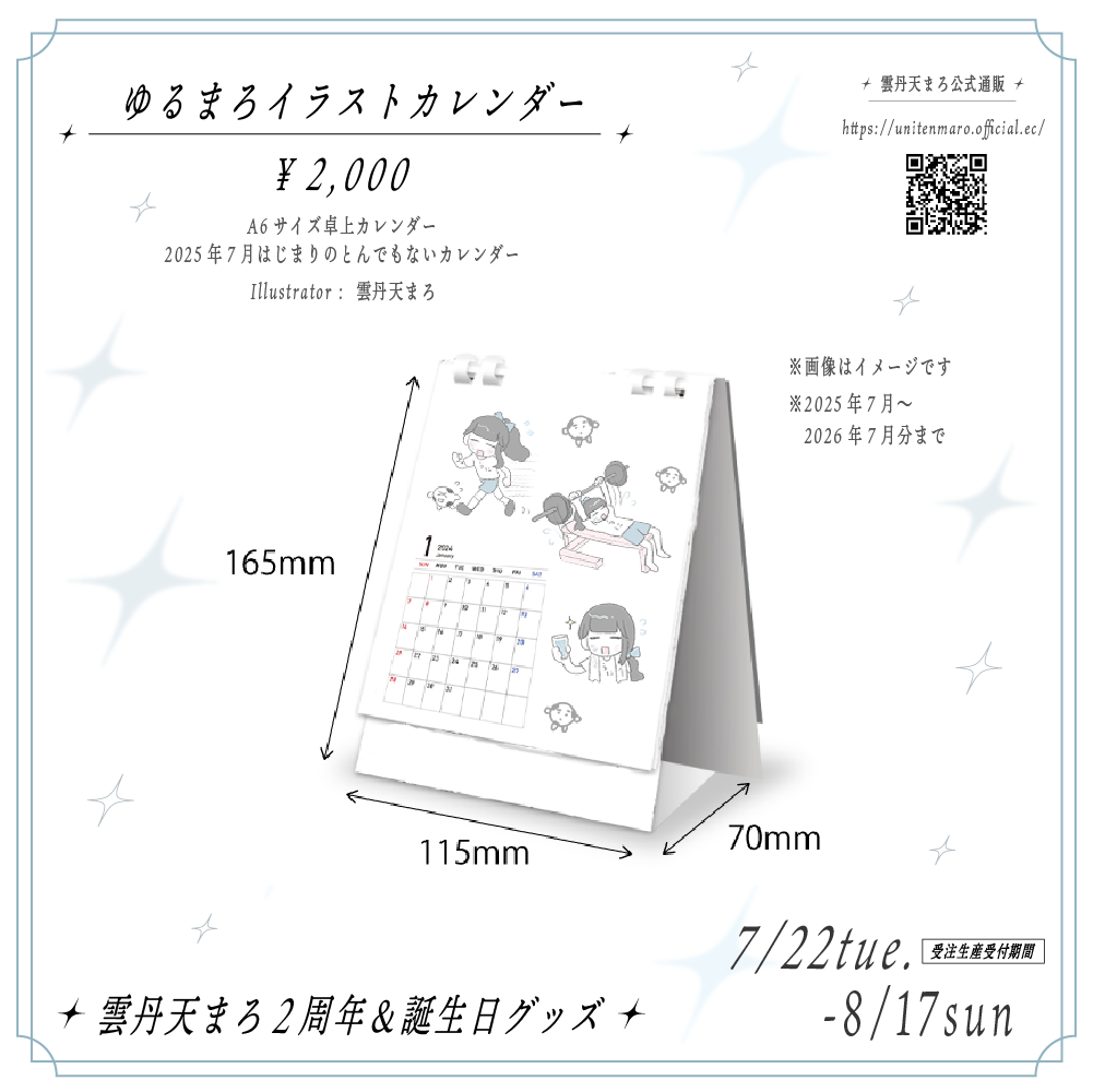 2025年の7月~2026年の7月まであるカレンダー 雲丹天まろは7月生まれの為、このようなカレンダーをご用意させていただきました! 雲丹天まろのゆるイラストが年中楽しめます♪